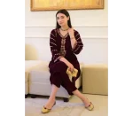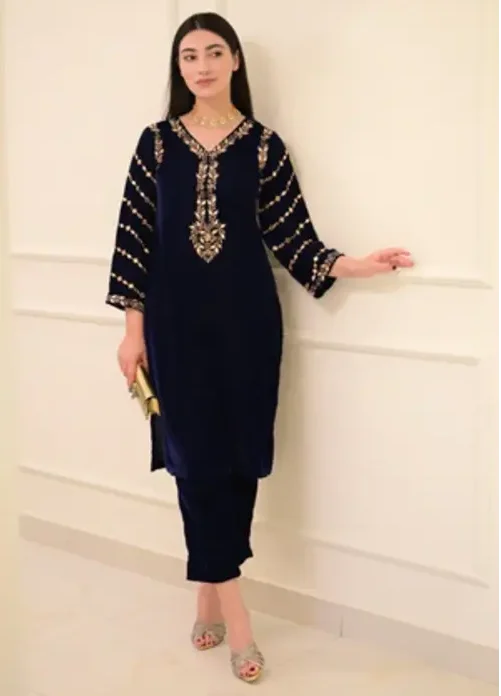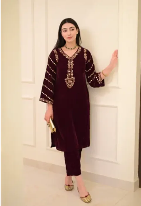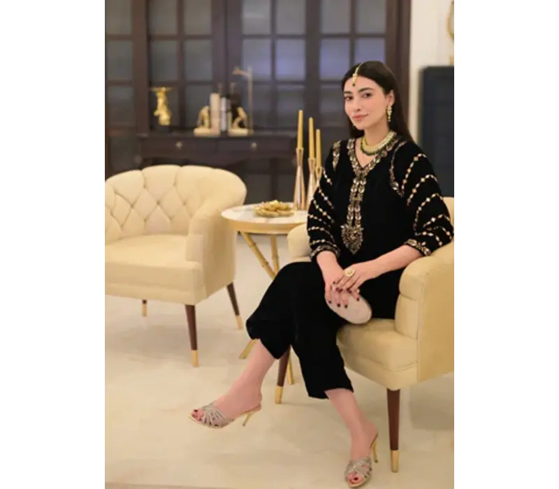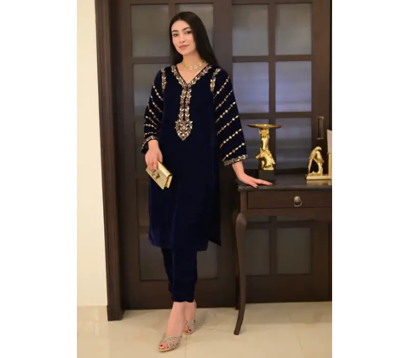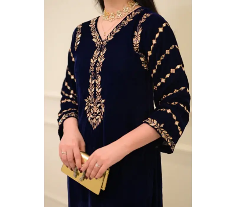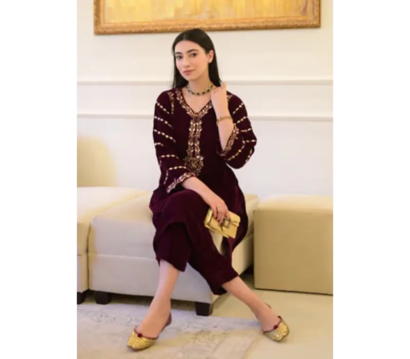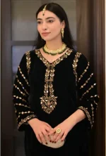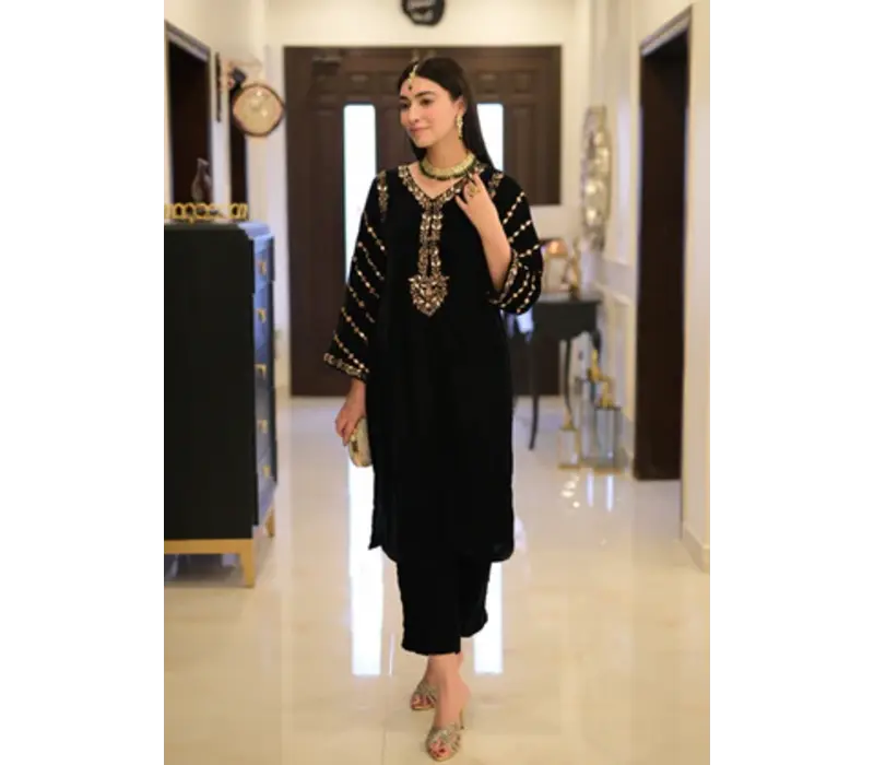 Elevate Your Style with 2-Piece Velvet Mirror Work Signature Set. Discover the perfect blend of elegance and craftsmanship with this stunning 2-piece velvet set, featuring exquisite mirror work. Ideal for any occasion, this signature  embodies luxury and sophistication. Make a statement with this unique addition to your wardrobe.