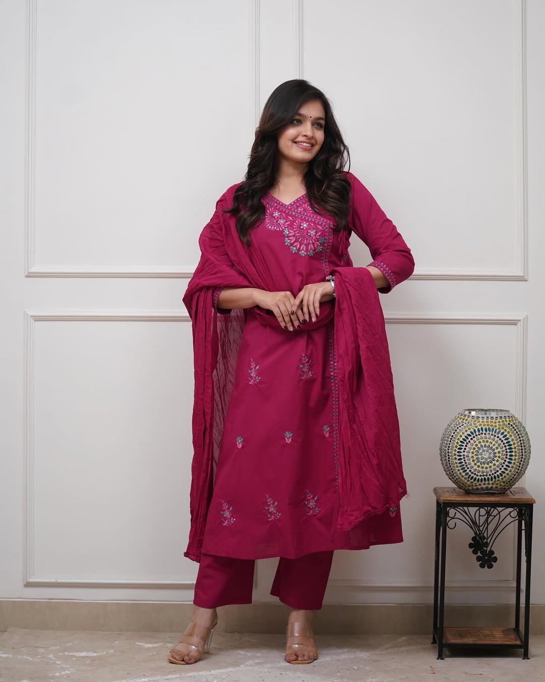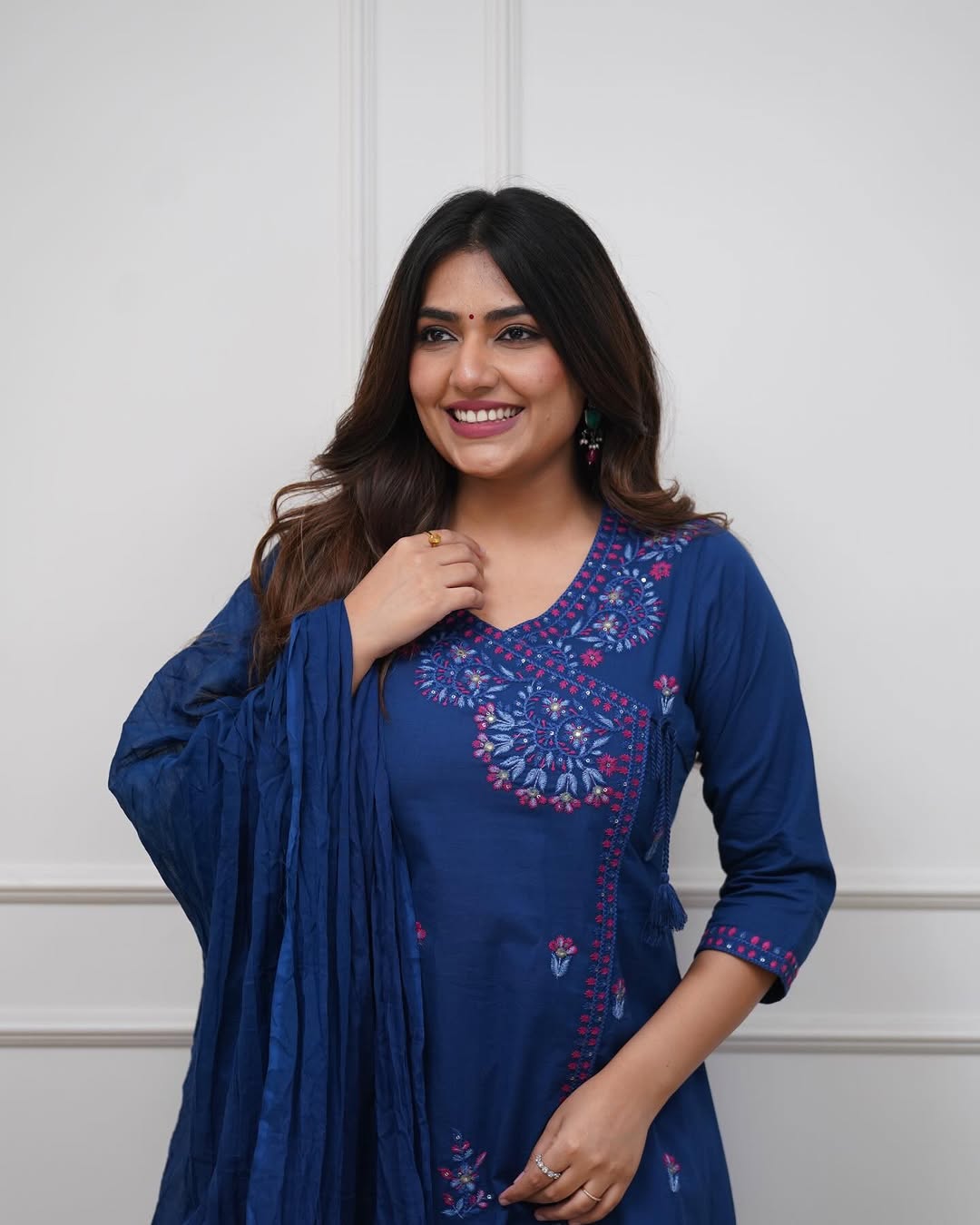 Crafted in soft cotton with an elegant angrakha silhouette, this set features intricate multicolour Lakhnawi embroidery that adds a touch of timeless ethnic charm.