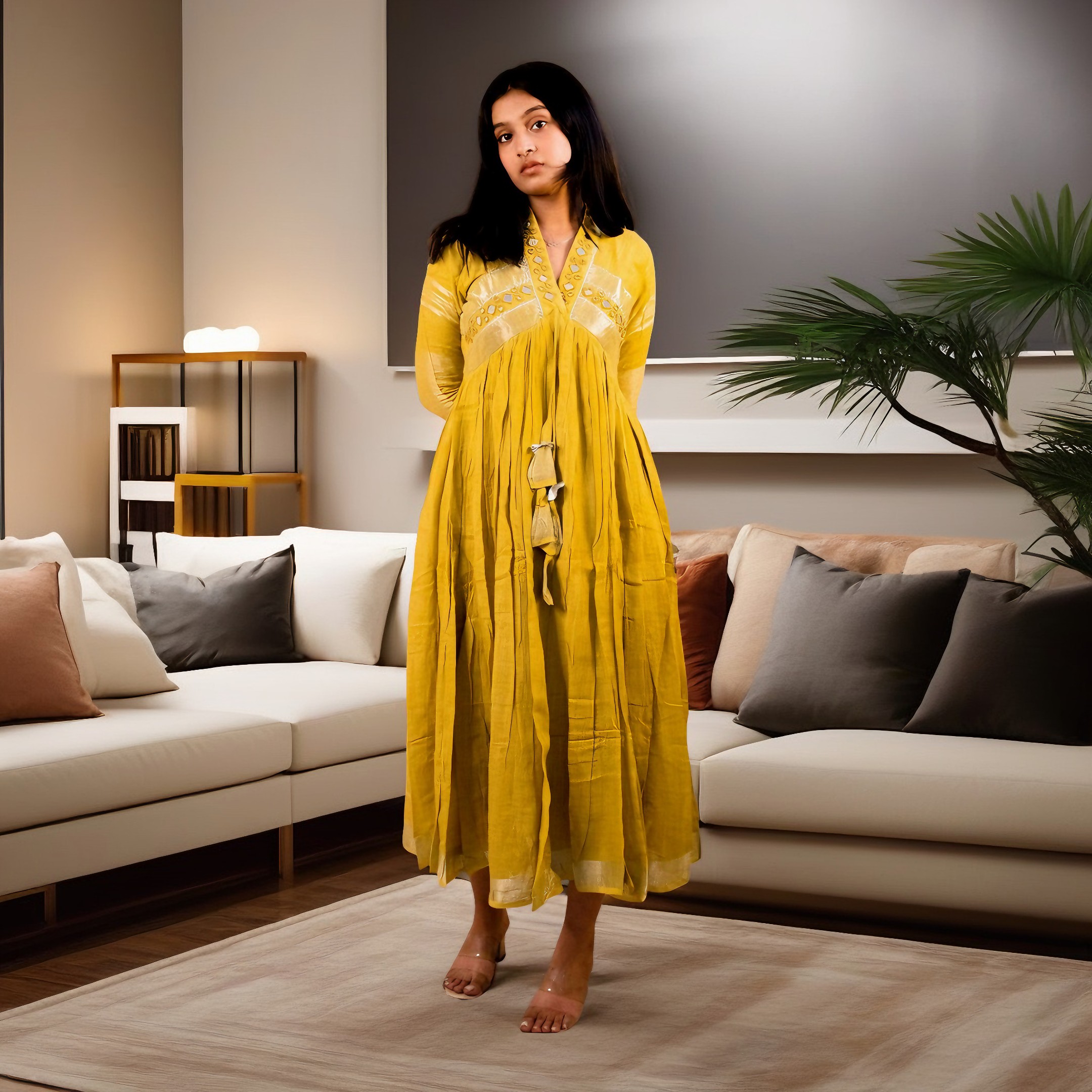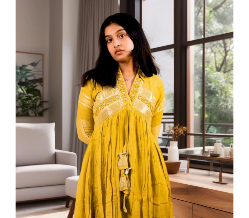 Expertly crafted from pure linen, fully lined for unmatched comfort, and designed with 5 meters of graceful flare. The dress features intricate hand embroidery embellished with real mirrors, bringing timeless artistry to life.