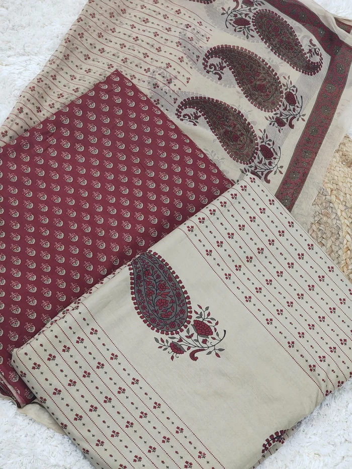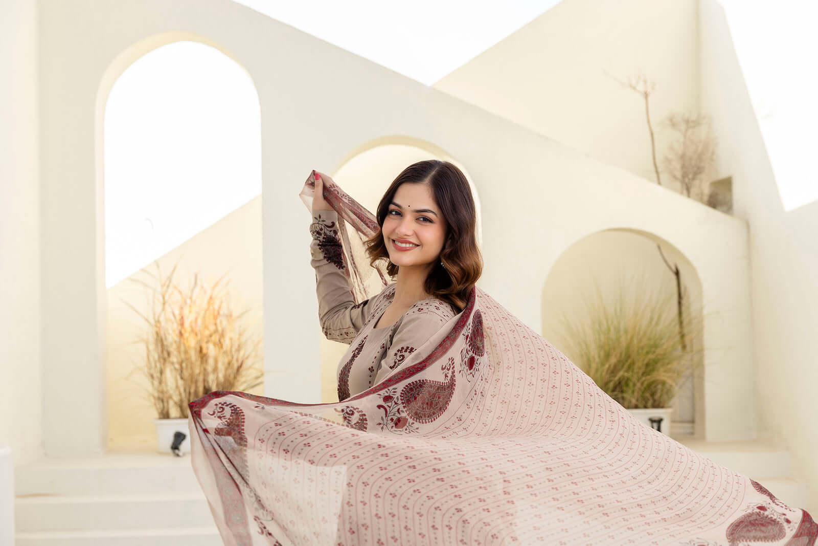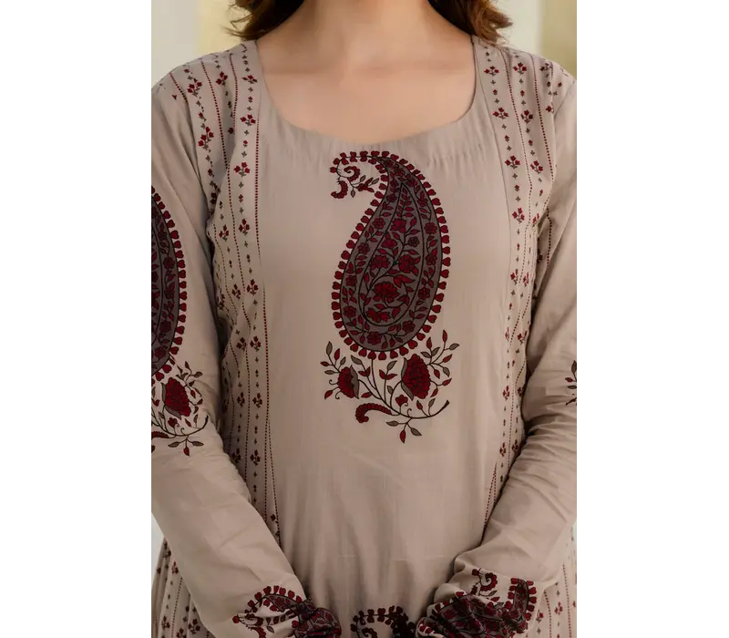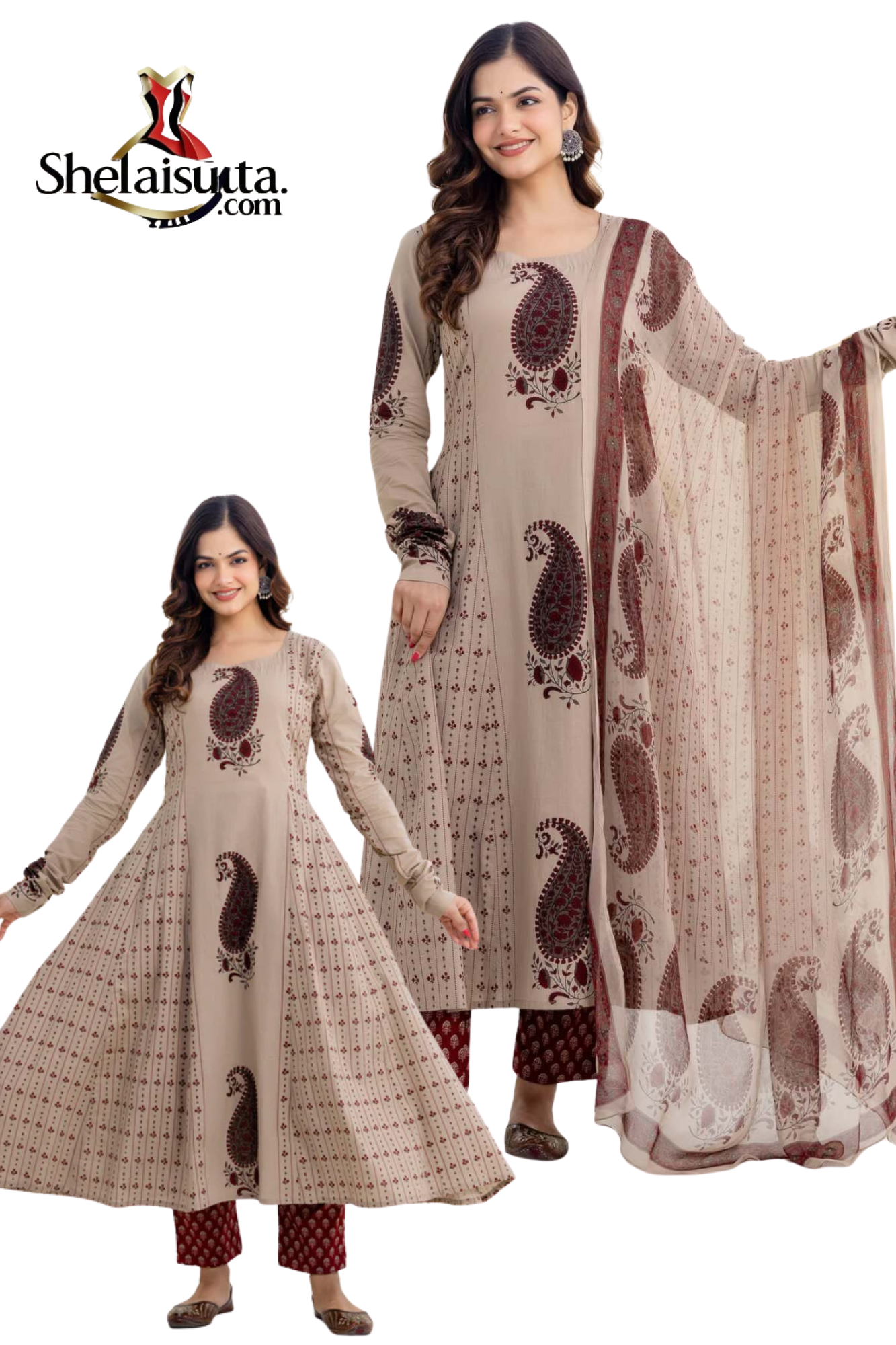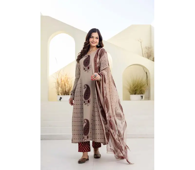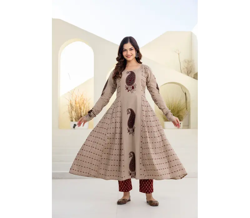 nic wardrobe with the Saanvi Beige Paisley Print Suit Set, crafted for effortless grace and everyday sophistication.